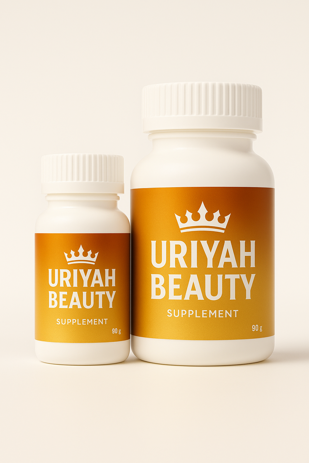 Two 'Uriyah Beauty' supplement bottles on a white background